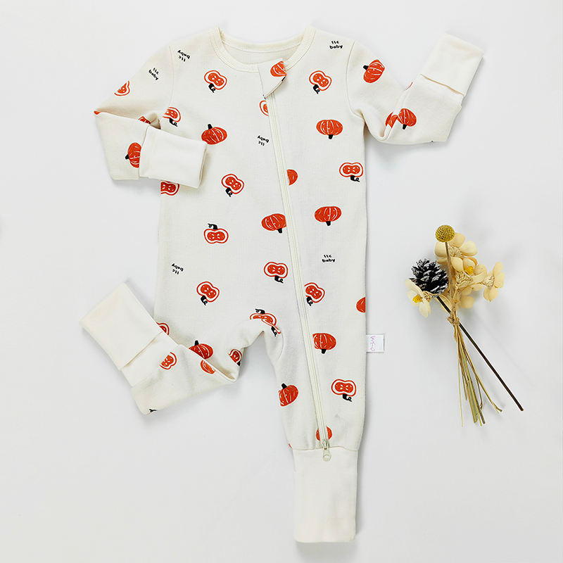 Custom Toddler Pajamas Cotton Pumpkin Printing 2 Way Zipper Sleeper Baby Convertible Zip Rompers Eco Friendly Baby Clothing